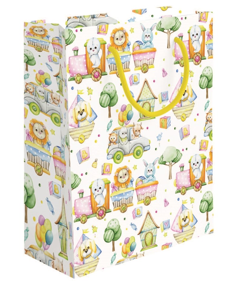 Gavepose large i matt utførelse med leketøy-motiv og kraftig bomullshåndtak. Produsert i Italia på FSC