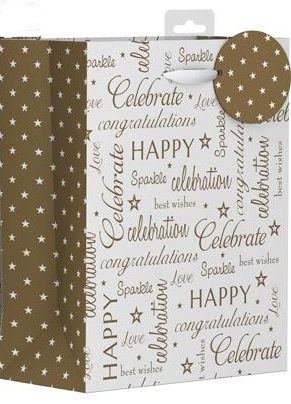 Gavepose med gullfoliert tekst, silkebånd og kort.