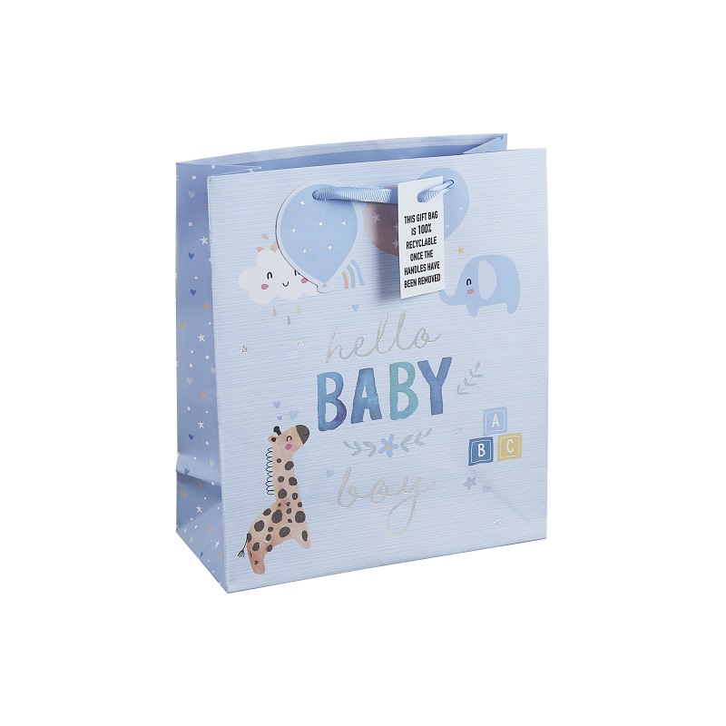 Medium gavepose med tekst "Hello Baby Boy", kraftig snor og pakkelapp. Gaveposen er 100% resirkulerbar når snoren er fjernet. Posen er produsert av papir fra ansvarlige kilder (FCS 0105249).