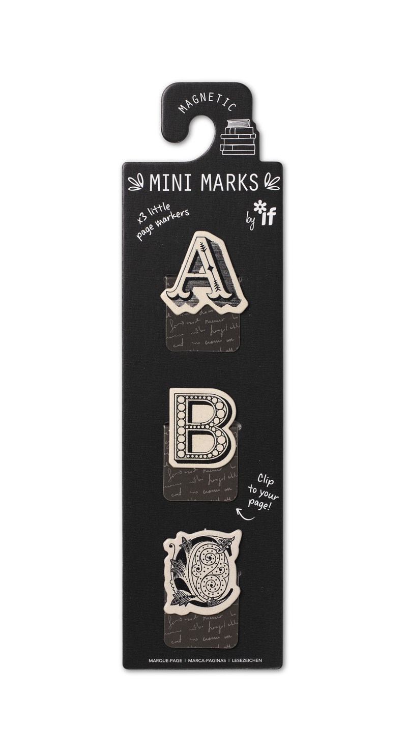 Sett med tre små klipsmagneter med bokstavmotiv som merker siden din uten å skade boken.