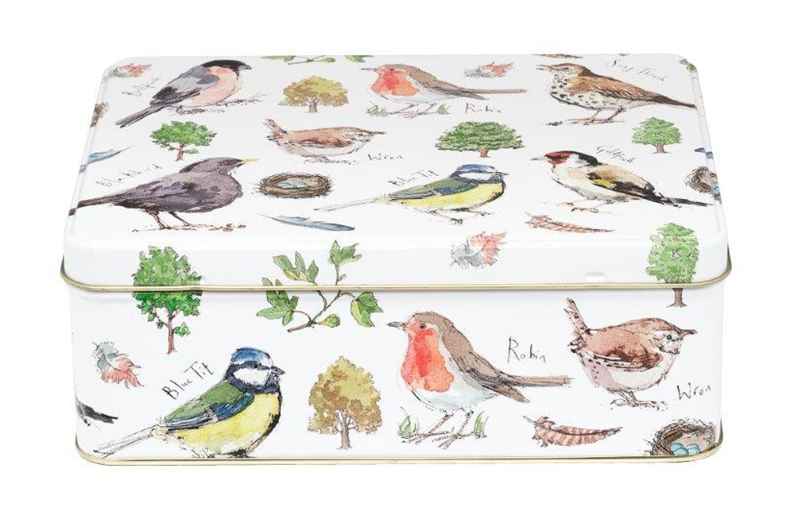 Rektangulær metallboks fra Elite Tins, England i "Bird Song" design fra Madeleine Floyd. Tegningene illustrerer småfugler som Dompap, Blåmeis, Svarttrost, Gråspurv, Rødstrupe m.fl.