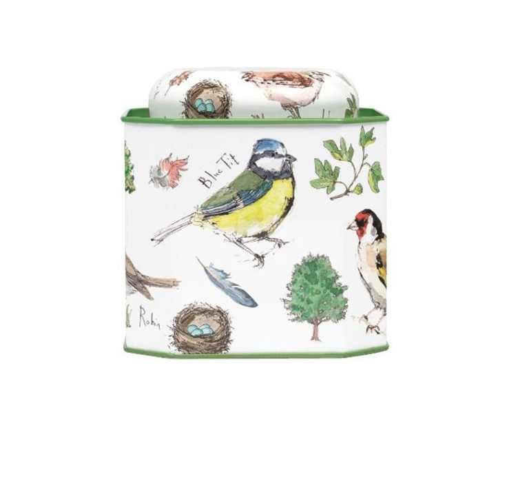 Kvadratisk metallboks fra Elite Tins, England i "Bird Song" design fra Madeleine Floyd. Tegningene illustrerer småfugler som Dompap, Blåmeis, Svarttrost, Gråspurv, Rødstrupe m.fl.