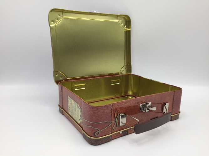 Liten metall-koffert med hengslet lokk og bærehåndtak, etter modell av Amerika-kofferten fra gamle dager.