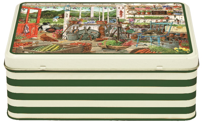 "Tracy Hall - Garden Shed" Rektangulær lunsjboks i metall med motiv fra hagen.