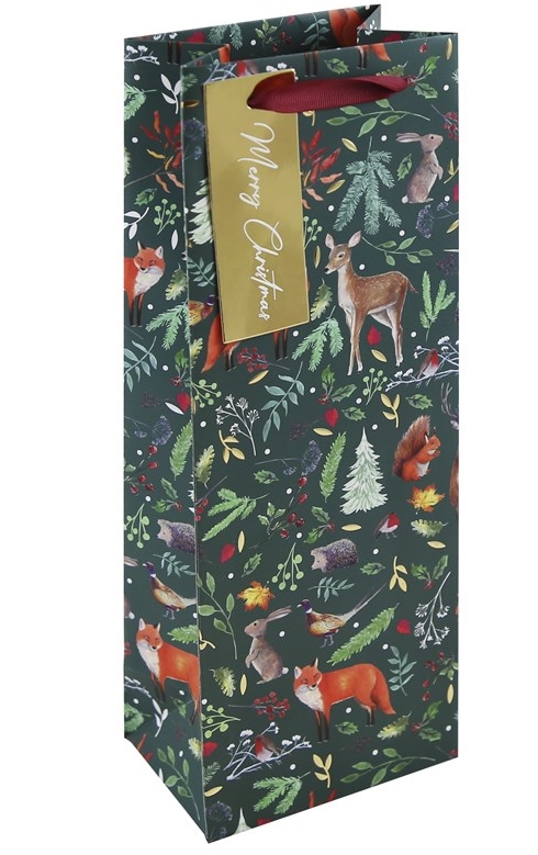 Vinpose i matt utførelse med motiv av nordiske dyr med gullfolierte detaljer, kraftig bomullshåndtak og pakkelapp. Produsert på FSC godkjent papir, FSC C105249.