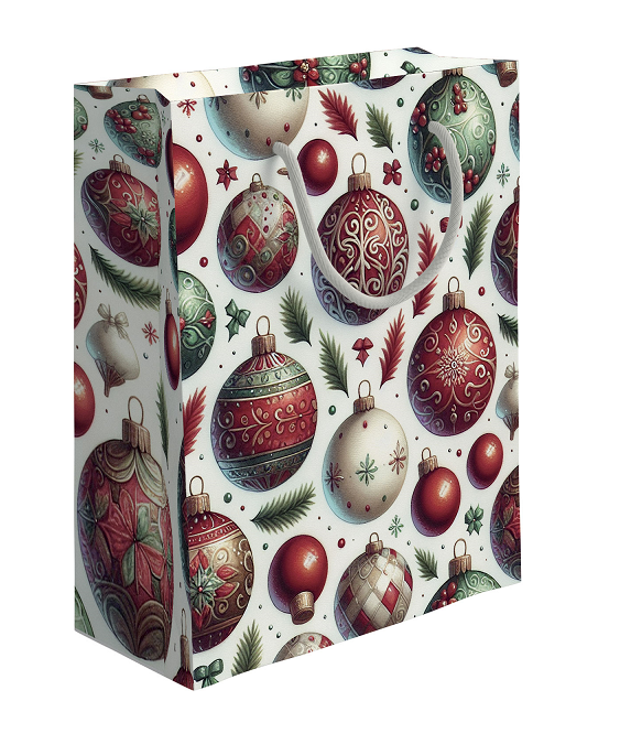 Gavepose medium i matt utførelse med julekule-motiv og kraftig bomullshåndtak.
