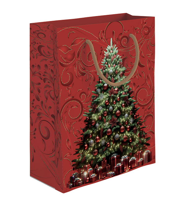 Gavepose medium i matt utførelse med juletre-motiv, gullfolierte detaljer og kraftig bomullshåndtak.