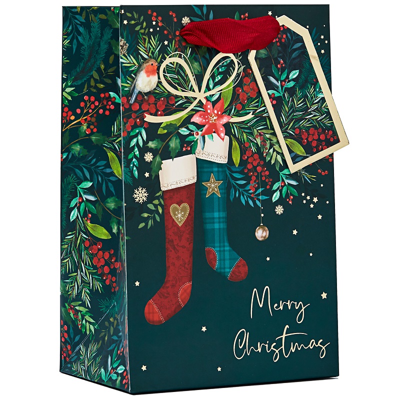 "Garland" Gavepose parfyme med kraftig rødt bånd, gullfolierte detaljer, pakkelapp og dekorert innside.