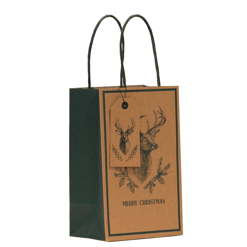 "Wild Stag" Parfyme gavepose med design av Violet med kronhjort i kraftpapir, dekorert innside og pakkelapp.