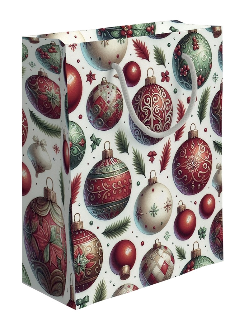Gavepose X-large i matt utførelse med julekule-motiv og kraftig bomullshåndtak.