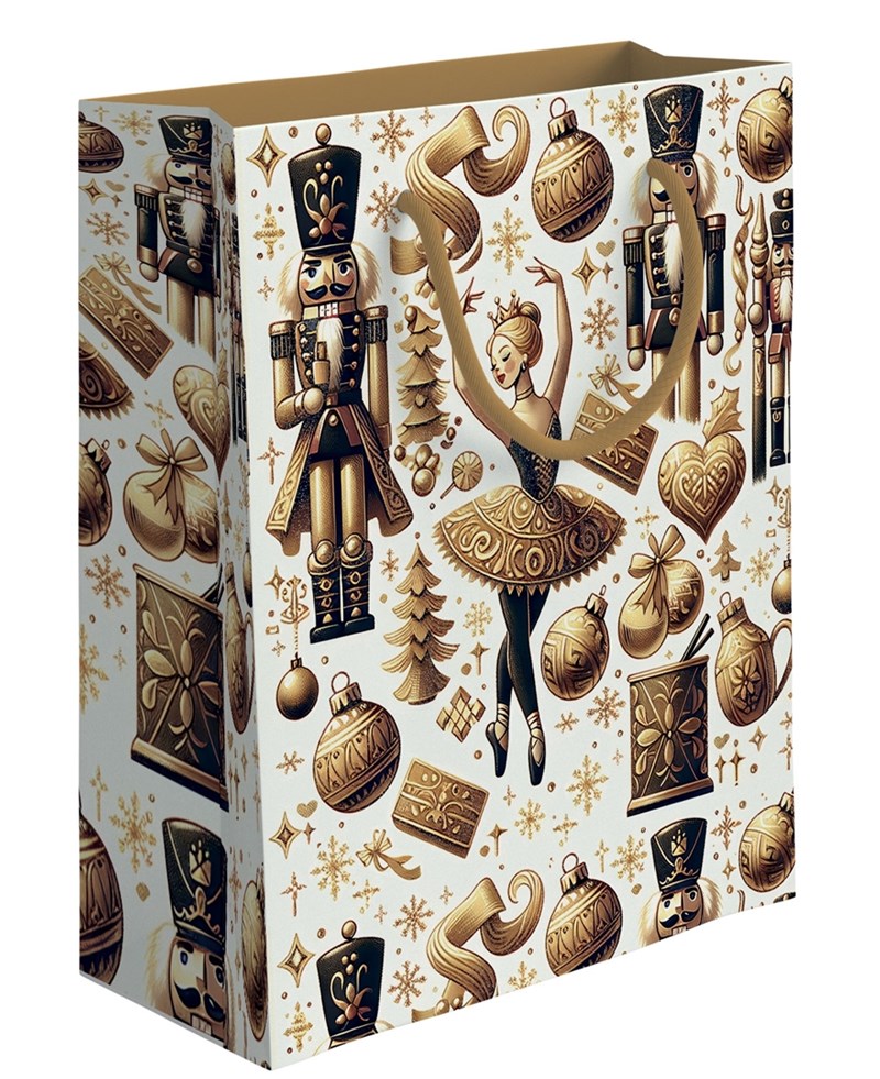 Gavepose X-large i matt utførelse med nøtteknekker-motiv, gullfolierte detaljer og kraftig bomullshåndtak.