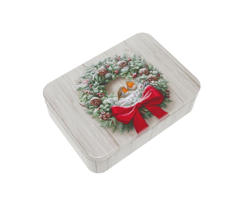 "Robin" Rektangulær metallboks. Dekorert med julekrans, sløyfe og dompap.