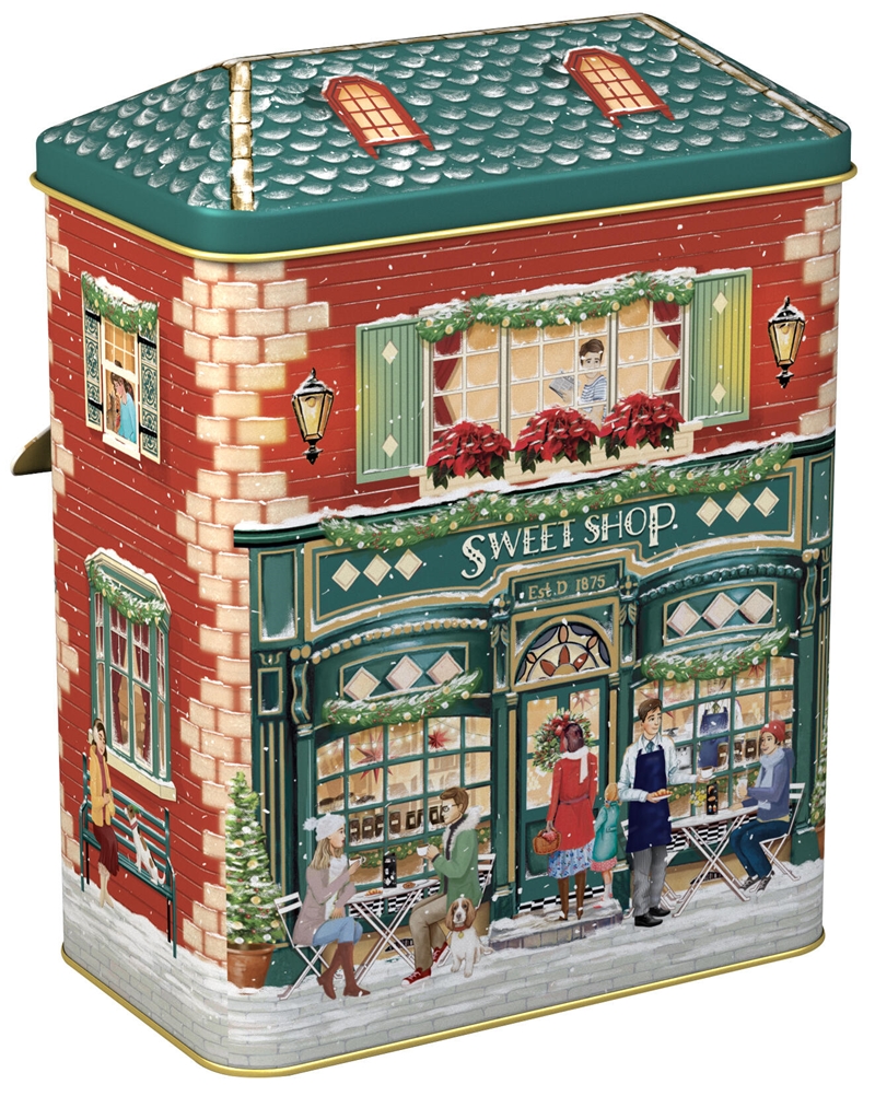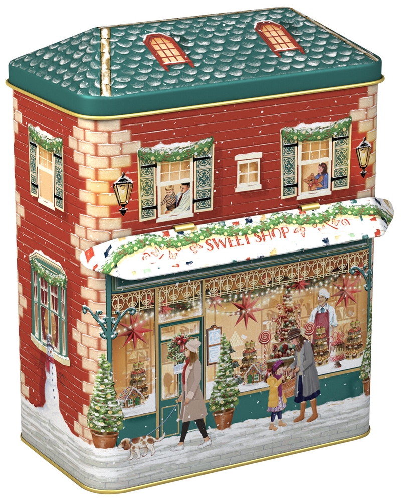 Flott og dekorativ metallboks utformet som et hus med hengslet lokk og baldakin.