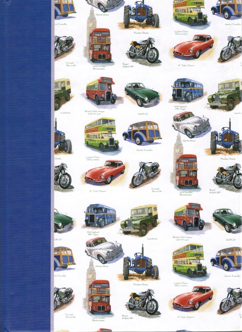Skrivebok i A5 med design av nostalgiske kjøretøyer. Designet viser følgende motorkjøretøyer, 1946 Leyland PS1 Tiger, Landrover, Bristol 1950 Vintage L5G 35 seat, MGB GT, Morris Minor, Fordson Dexta, Leyland Titan TD1s (1931), Morris Traveller, 1959 London Routemaster, Royal Enfield SP, E Type Jaguar og Triumph Bonneville.