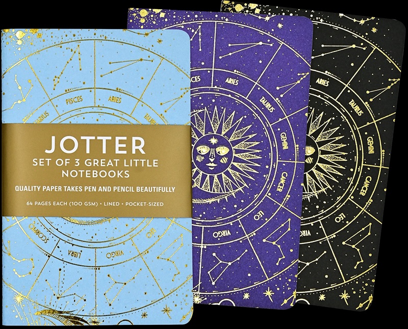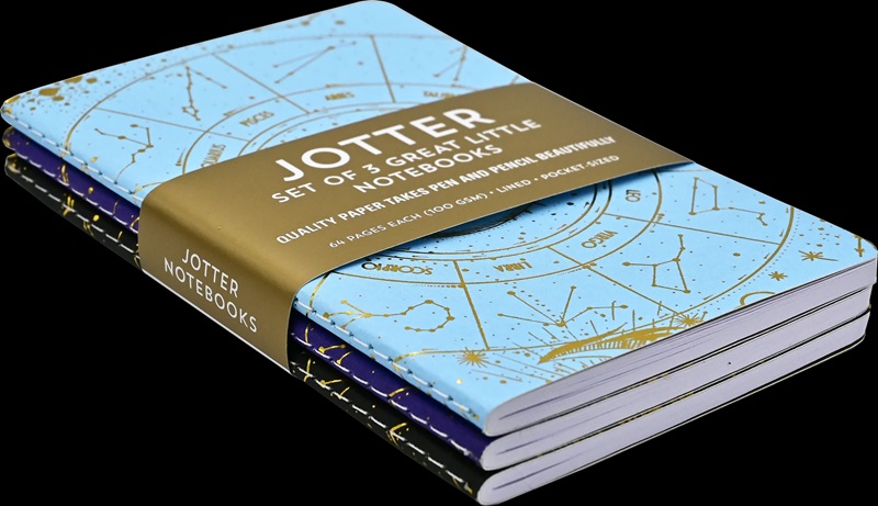 "Celestial" 3 stk. små assorterte notatbøker, 64 linjerte sider i 100 grams papir og gullfolierte detaljer.