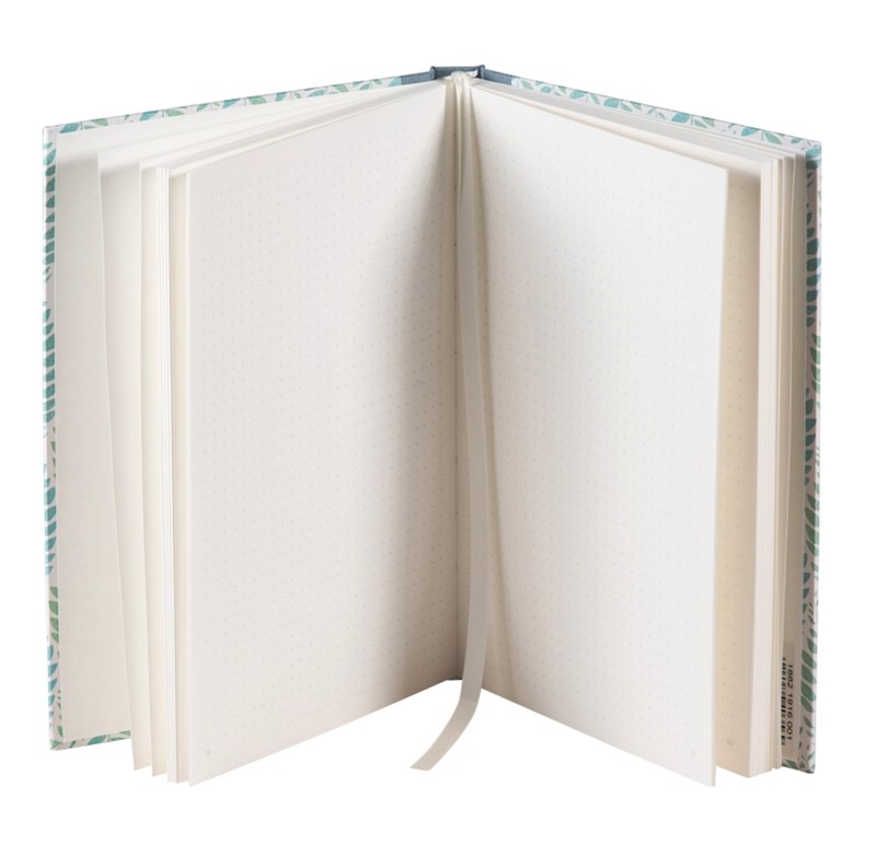 "Pastel Leaves" Innbundet dotted journal (skrivebok), med 192 sider 100 grams offwhite papir og snor-bokmerke.